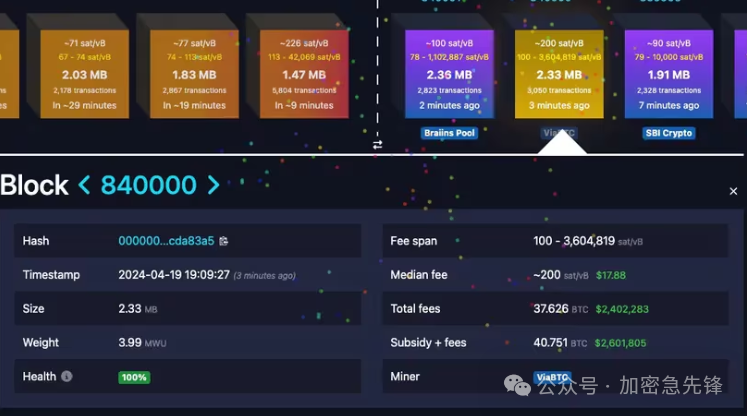 *比特币减半发生在周六早些时候,颠覆了运行开创性区块链的经济性。*之后,随着一个名为Runes的基于比特币的新系统的推出,费用飙升。比特币在其 15 年的历史中完成了第四次减半,这是区块链社区中备受推崇和期待的里程碑,就像世界杯和奥运会在体育运动中一样。这项每四年一次的活动于UTC时间周六00:09举行,将矿工因创建新比特币而获得的奖励减少一半,当时第840,000个区块被添加到比特币区块链中。虽然比特币的价格在之后基本稳定在63,000美元以上,但其他事情抢尽了风头:比特币的交易费用飙升,因为一个名为Runes的新协议的推出导致了一连串的交易,因为投机者急于在区块链上铸造数字代币。减半区块(840,000 个区块)的附加费用为 37.6 BTC(价值超过 240 万美元),创下历史新高,在减半后的小时内,费用仍远高于正常水平。该区块的获胜矿池是 ViaBTC,它有权以刚刚降低的每区块 3.125 BTC 的新利率获得比特币奖励,按当前价格计算价值约 200,000 美元。但加密矿工一直在积极竞争该区块,因为它包含减半后的第一个“sat”——比特币的最小面额。减半后的这些“史诗般的坐姿”被视为收藏品,一些矿业高管表示,比特币的这个碎片可能价值数百万美元,或者是整个比特币当前价格的数倍。