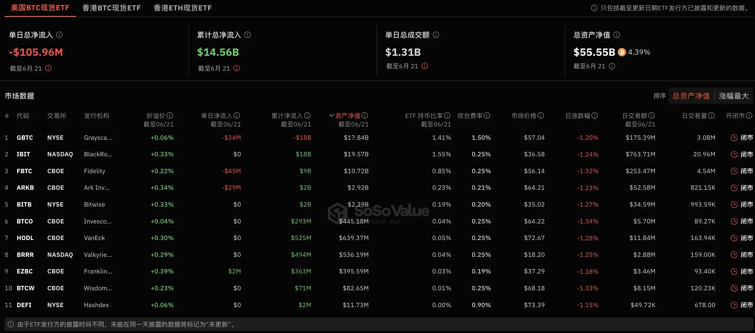 Foresight News 消息,根据 SoSoValue 数据,昨日(美东时间 6 月 21 日)比特币现货 ETF 总净流出 1.06 亿美元。昨日灰度(Grayscale)ETF GBTC 单日净流出 3420.43 万美元,目前 GBTC 历史净流出为 183.60 亿美元。