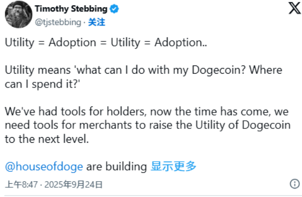 狗狗币基金会理事蒂莫西·斯特宾 (Timothy Stebbing)就实用性对狗狗币的意义以及当前推动狗狗币实用性的动力发表了看法。根据 Stebbing 的说法,对于狗狗币来说,实用性等同于采用,意思是“我可以用我的狗狗币做什么?我可以在哪里使用它?”狗狗币基金会理事表示,虽然已经为持有者开发了这方面的工具,但现在是时候为商家创建工具,以将狗狗币的实用性提升到一个新的水平。Stebbing指出,狗狗币基金会的官方企业机构“houseofdoge”正在构建商家解决方案,从基层开始,逐步构建到企业级的区块链。此举旨在推动狗狗币的普及,将下一个十亿人带入这个生态系统。在另一条推文中,斯特宾批评了加密社区一些成员所描绘的“狗狗币是个笑话”的想法,并指出这反映了为社区构建工具的必要性,以动员下一代商人和骗子在狗狗币第一层上更好、更快、更强地开展业务。 狗狗币ETF欢迎期权交易 对于狗狗币来说,令人兴奋的消息是,数字资产管理公司 Rex Osprey 宣布,期权现已在 REX-Osprey DOGE ETF、DOJE 上交易,为投资者提供了更大的灵活性来对冲头寸、追求收入潜力并快速响应不断变化的数字资产格局中的机会。 DOJE 是美国首个现货狗狗币 ETF,于上周推出,令加密社区兴奋不已。 过去24小时内,狗狗币的鲸鱼活动有所增加。据Whale Alert称,126,275,187枚狗狗币(价值29,860,454美元)从Gate钱包转移到一个未知钱包。此外,总计349,400,000枚狗狗币(价值83,281,841美元)也在未知钱包之间转移。9月23日,8亿枚狗狗币(价值189,773,571美元)从一个未知钱包转移到币安。
