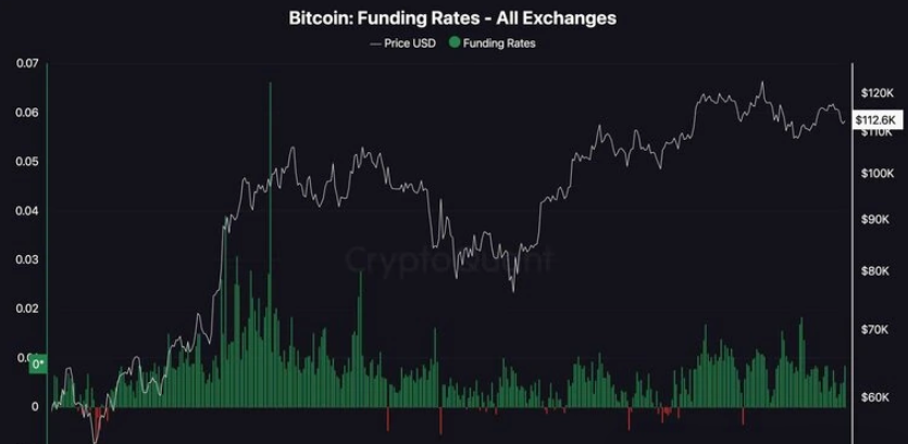 融资利率走势反映市场情绪的显著变化。2024年12月,比特币逼近12万美元时,融资利率飙升至极高正值,显示市场过热,激进多头仓位主导,杠杆过度导致回调脆弱。相比之下,2025年8月价格重回高点区域,融资利率却较为温和,表明交易员杠杆使用更为克制,回调幅度较小,市场结构更健康。