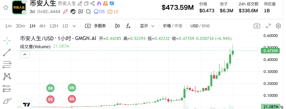 据 GMGN 行情显示,币安人生自 10 月 4 日晚上线后,从低点 0.001 美元附近一路上涨,在被宣布上线币安 Alpha 后,不断创下历史新高,也成为近年来第一个被币安上线的中文币种。目前币安人生最高最高冲至 0.5 美元上方,现回落至 0.47 美元附近,市值跃升超 4.7 亿美元,24 小时成交额则达到 3.366 亿美元。