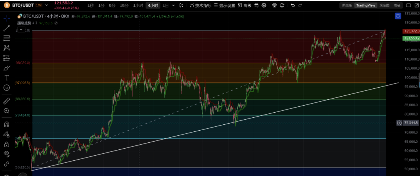 上图为4H趋势图,下图为15分钟趋势图。指标(1)采用斐波那契数列,每一级为支撑或回调位。指标(2)超级趋势,右侧指标,走势图下方,绿色代表上涨趋势,红色代表下跌趋势。指标(3)自己画线通道,判断是否走出趋势。