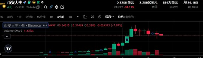 10月9日“币安人生”有所回落,截至发稿,报0.3206美元,24小时跌幅34.11%。