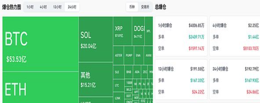 Coinglass数据显示,过去24小时全网爆仓升至192.79亿美元,再次刷新历史记录,全球共有1,657,646人被爆仓,其中多单爆仓167.94亿美元,空单爆仓24.85亿美元,最大单笔爆仓单发生在Hyperliquid平台的ETH-USDT合约交易对,价值2.03亿美元。币种方面,比特币爆仓53.53亿美元,以太坊爆仓44.12亿美元,SOL爆仓20.04亿美元,HYPE爆仓8.90亿美元,XRP爆仓7.07亿美元。