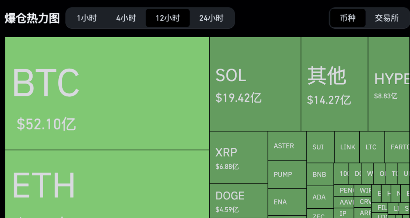 龙头币种成为主要爆仓来源,比特币合约清算金额高达52.1 亿美元;以太坊则落在41.78 亿美元。 Solana 约19.42 亿美元、XRP 6.88 亿美元的仓位被爆。