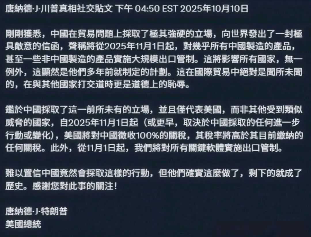 特朗普的社交媒体帖子与中国的稀土管制公告,短短几小时内将全球两个最大经济体重新推向全面贸易战的边缘。
