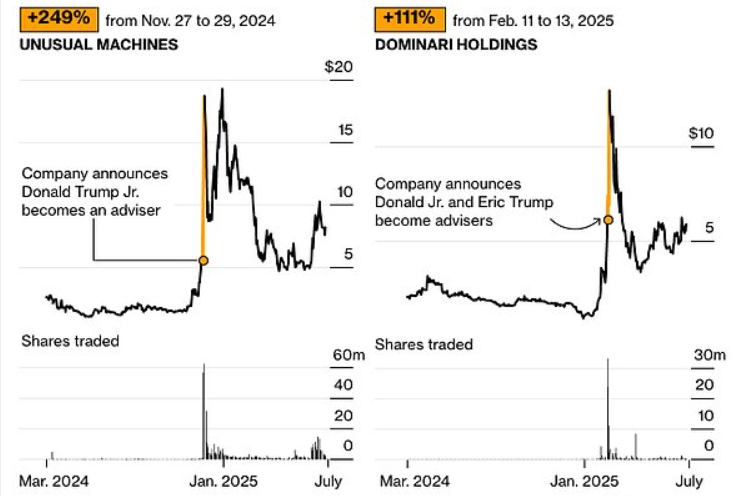 特朗普的名字往往能引发股票推销员们梦寐以求的轰动效应。以奥兰多一家亏损的无人机公司Unusual Machines Inc.为例。2024年大选结束三周后,有消息称小唐纳德·特朗普不仅成为该公司的投资者,还担任该公司的付费顾问——这桩交易是由Wool安排的。证券备案文件显示,该公司股价在三天内上涨了两倍多,为这位总统的长子带来了440万美元的账面收益。随后,其他公司也达成了类似的交易,将特朗普家族成员与一只此前默默无闻的股票挂钩,并在随后的宣传中蓬勃发展。