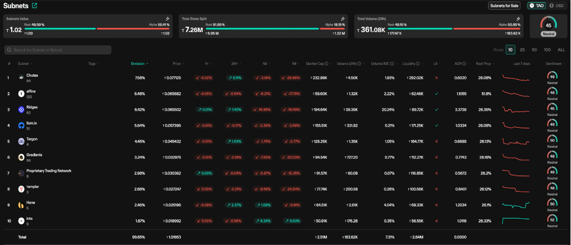目前,发行量最高的顶级子网代币有 Chutes、Ridges、Gradient 等。其中一些子网也得到了风投的支持,比如 Gradient 正在构建 AI Trains 平台。它由 Rayon Labs 构建,该公司还运营着按发行量计算领先的子网 Chutes。许多这些子网都在相互协作以交换服务。例如,Ridges 就是 Chutes 的客户;Sportstensor 正在为体育博彩和预测构建 AI 模型;还有像 OpenKaito 这样的子网,为 Kaito 的 InfoFi Pioneer 提供支持。Taofi 也是 Bittensor 的一部分。他们推出了一款 DEX,让您能够轻松地从 Base 网络中桥接和交换子网代币。