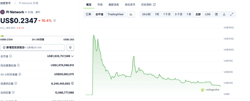 CoinMarketCap 数据显示,Pi 币价格已跌至 0.24 美元,较 2 月主网初期的峰值 2.98 美元暴跌 92%,180 亿美元市值在 8 个月内蒸发殆尽。