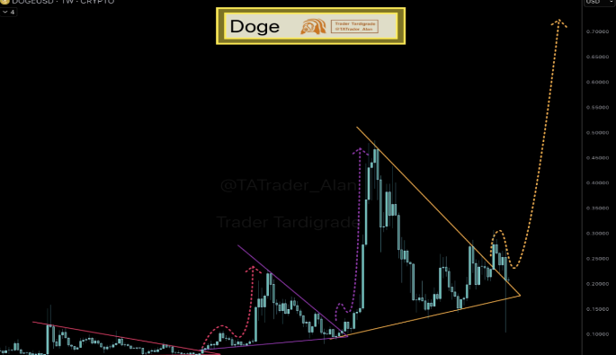 狗狗币交易价为 0.1988 美元,当日下跌 5.8%,但处于本周的三角形形态内。