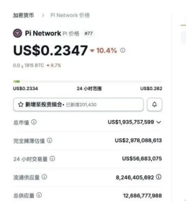 2025年10月8日,CoinMarketCap数据显示,Pi币价格已跌至0.24美元,较2月主网初期的峰值2.98美元暴跌92%,180亿美元市值在8个月内蒸发殆尽。