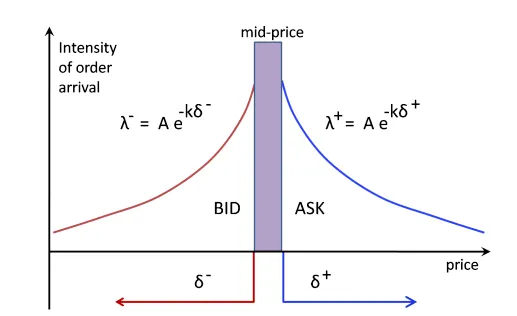 该模型的核心思想是,当做市商的库存 (q) 偏离其目标(通常为零)时,模型会系统性地调整报价中轴,以激励市场成交能使其库存回归均衡的订单。例如,当持有多头库存 (q>0) 时,模型计算出的r(s,q,t)将低于市场中间价 s,这意味着做市商会将其买卖报价整体下移,使得卖单更具吸引力,买单更不具吸引力,从而增加平掉多头库存的概率。