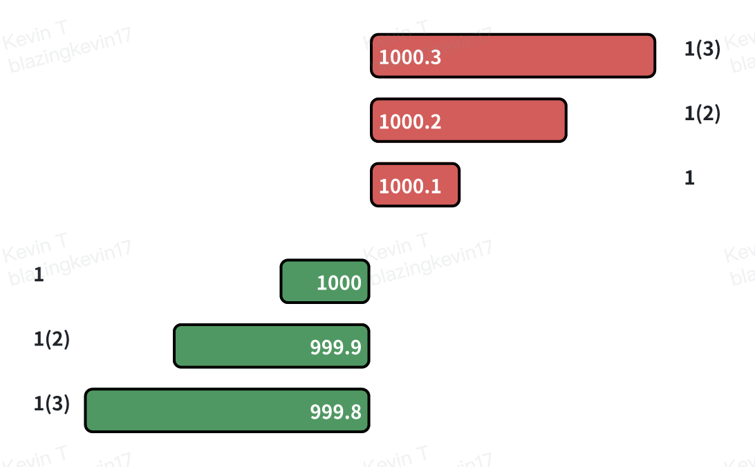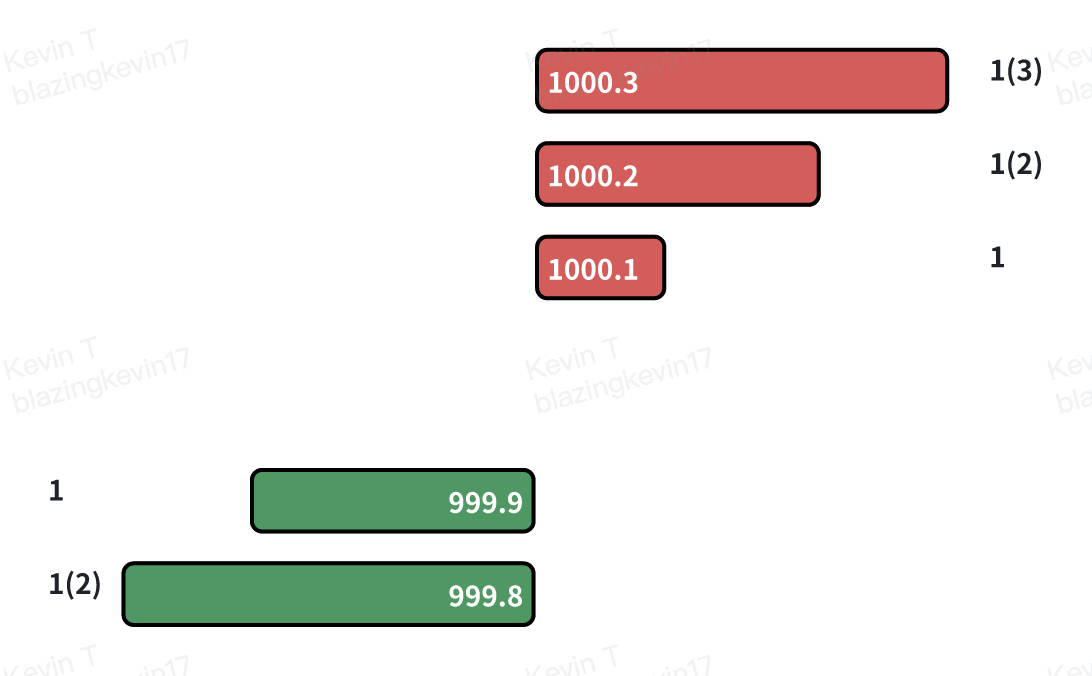 当前价差 (Spread): 最优买价 ($1000.0) 与最优卖价 ($1000.1) 之间的差额为 $0.1。