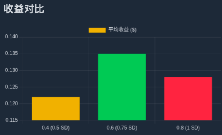C. 寻找最优解 通过对不同价差进行迭代计算,可以发现:价差 $0.2 预期收益约 $0.08;价差 $0.4 预期收益约 $0.122;价差 $0.6 预期收益约 $0.135;价差 $0.8 预期收益约 $0.128。结论是在此模型下,最优价差为 $0.6,即在距离均价 $0.3 (约 0.75σ) 的位置挂单,能实现期望收益的最大化。