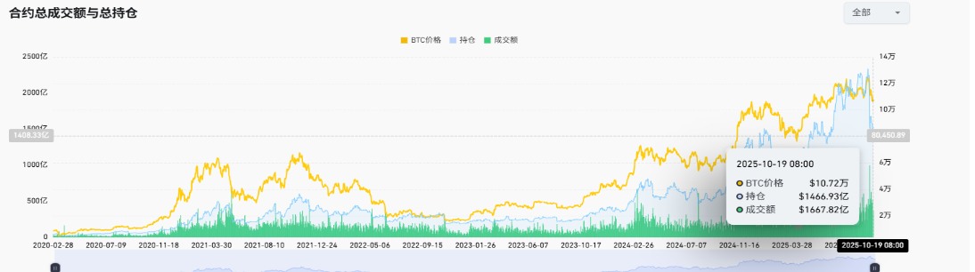 首先从合约的持仓量来看,市场总体的合约持仓量随着这场暴跌出现了大幅下降,根据Coinglass的数据显示,10月8日,市场的未平仓合约总量达到了历史高点2335亿美元,而到了10月19日,这一数据下降至1466亿美元,降幅达到了37%。