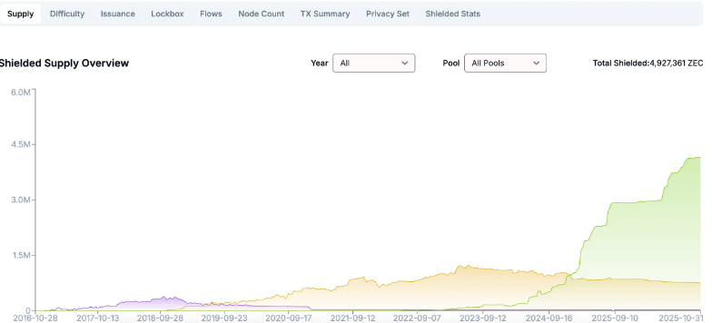 与此同时,最新数据显示,或受生态协议 Orchard 升级影响,Zcash 的隐私池(Shielded Supply)代币总量近期已突破 490 万枚,高达 492.7 万枚,约占流通总量的 30%,真实采用量不言自明。