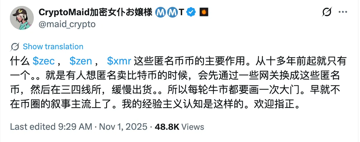 加密 KOL CryptoMaid 发文表示:“什么 ZEC、ZEN、XMR,这些匿名币的主要作用。从十多年前起就只有一个——就是有人想匿名卖比特币的时候,会先通过一些网关换成这些匿名币,然后在三四线所,缓慢出货。所以每轮牛市都要画一次大门。早就不在币圈的叙事主流上了。”
