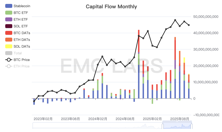 此后,随美中在APEC会议期间达成共识,暂停多项对峙举措;美联储亦在10月29日进行本年度第二次将息;叠加Q3财报超预期利好,美股再创月度新高。而BTC却反弹无力,依然挣扎于200日均价(“特朗普底”上沿110000美元)这一牛熊分界线,截止月底已经回吐7月以来的全部涨幅。