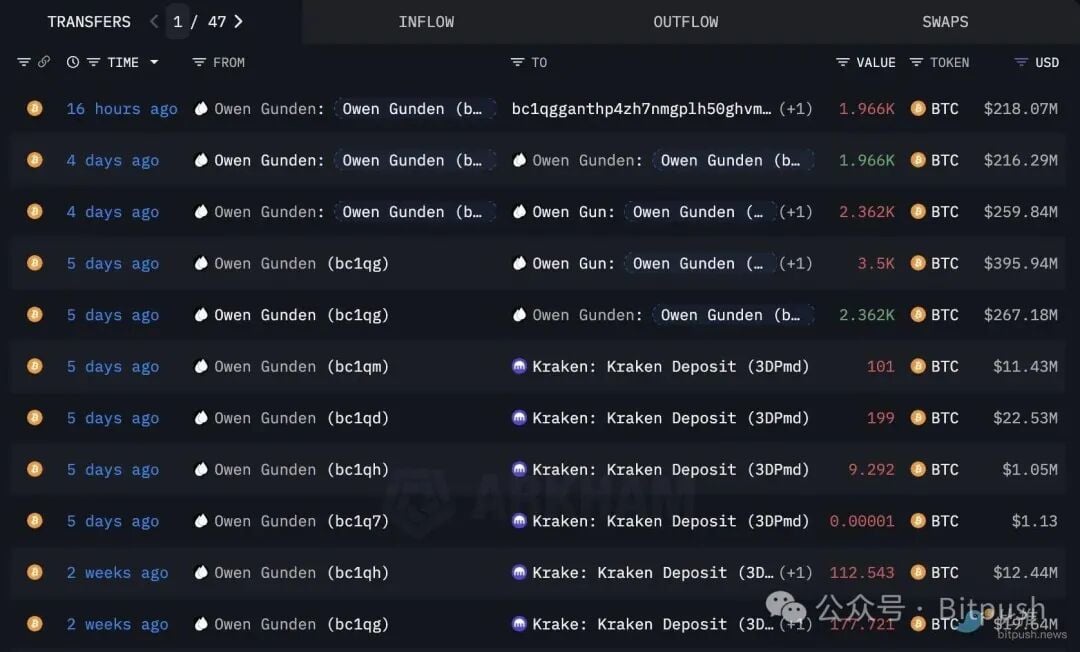 链上数据提供商CryptoQuant监测显示,市场内部早已暗流涌动。知名做空巨鲸“1011short”自10月1日以来,持续向Kraken等交易所转入13000枚比特币,价值约14.8亿美元。中本聪时代的早期投资者Owen Gunden也在沉寂多年后开始行动,先后向交易所转移3265枚比特币。