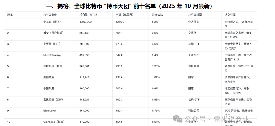 一、揭榜!全球比特币 “持币天团” 前十名单(2025 年 10 月最新)