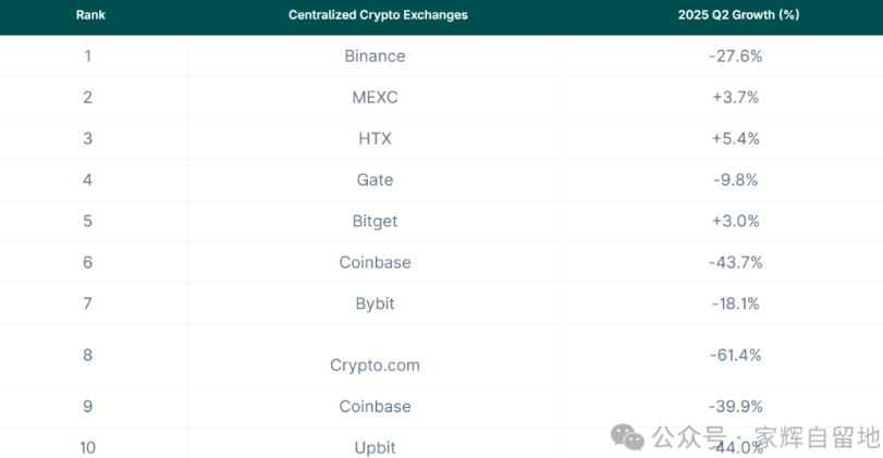 排名前 10 位的中心化加密货币交易所及其第二季度的增长情况如下: