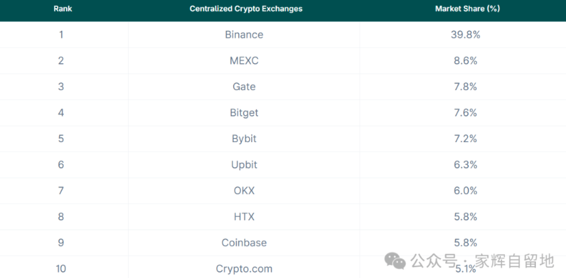 按市场份额排名前 10 位的中心化加密货币交易所如下: