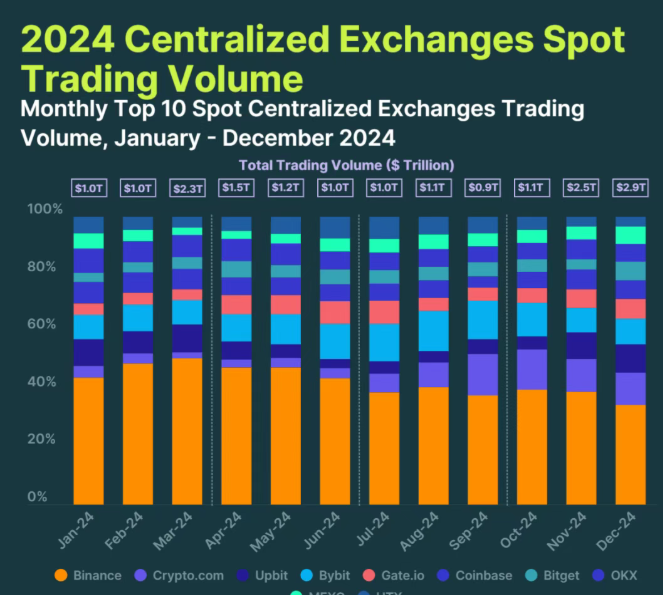 下图显示了 2024 年现货交易量排名前 10 位的中心化交易所的市场份额:
