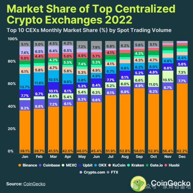 下图显示了 2022 年现货交易量排名前 10 位的中心化交易所的市场份额: