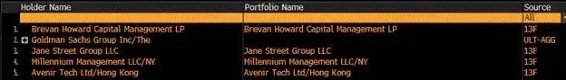 这些是 IBIT US 的五个最大持有者。他们是大型对冲基金或专注于自营交易的投资银行,例如高盛。