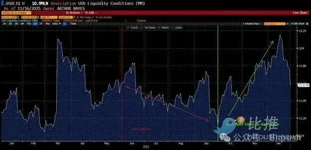 与我的负面美元流动性理论相反的论点是,随着美国政府在停摆后恢复运作,TGA 将迅速减少 1000 亿至 1500 亿美元,以达到 8500 亿美元的目标,这将为系统增加流动性。此外,美联储将在 12 月 1 日停止缩减资产负债表,并很快通过量化宽松(QE)恢复资产负债表扩张。