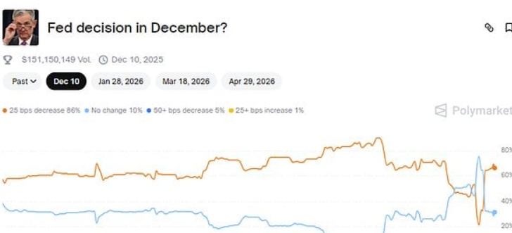 Polymarket 上预测美联储12月降息25个基点概率升至67%。