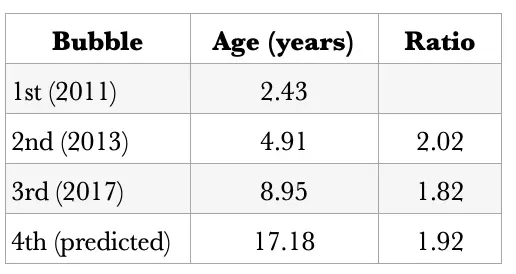 粗略地观察年龄比率。前两个相邻的大泡沫之间的比率分别为 2.02 和 1.82,取平均1.92,第四次泡沫大约在年龄 17.18 年(2026 年初)。当然,这只是粗略的初步猜测。