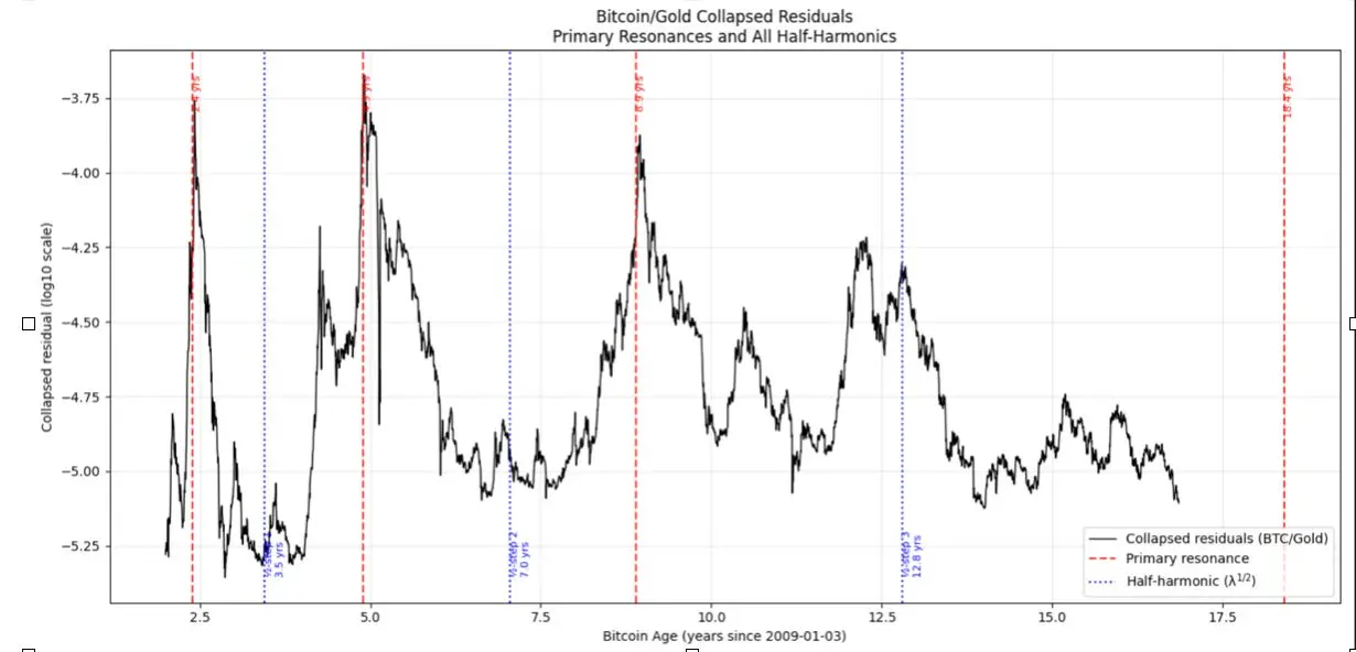 DSI 的基模波长参数 λ = 2.07(对数时间),大致对应泡沫间隔的两倍。2017 年泡沫是最后一个基模,2021 年是第一次谐波,2025 年在本框架下预期不会出现泡沫。下一轮以黄金计价的比特币峰值预计在 2026 年四季度(小波分析最低值)至 2027 年二季度(傅里叶分析值)之间出现。