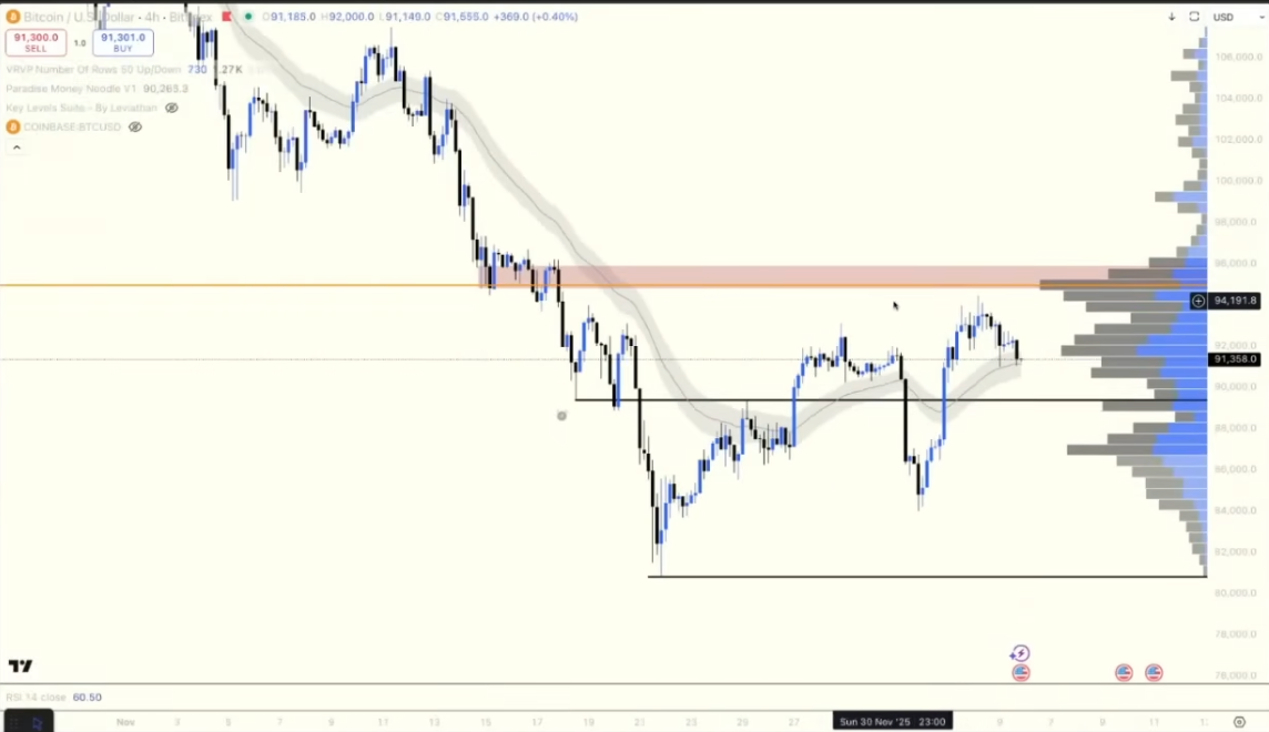 Miles:目前市场上方仍然存在较大的阻力区域,如果我们观察日线图,可以看到价格正在试图突破上方的均线;而在 4 小时图中,成交量可视范围 (VRVP) 的控制点(POC)仍然位于 96,000 附近,这一带形成了明显的阻力区域。