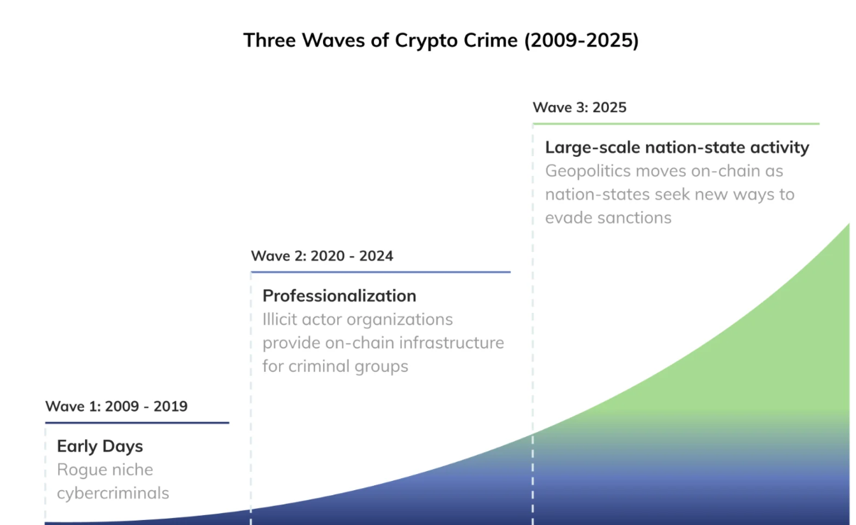 2025 年,我们监测到国家层面的加密货币相关活动显著增加,标志着非法链上生态系统发展进入了成熟新阶段。过去几年间,加密犯罪领域的专业化程度不断加深;非法组织现已搭建起大规模链上基础设施,为跨国犯罪网络采购商品服务、清洗加密犯罪所得提供支持。在这一背景下,各国政府也开始涉足该领域,它们一方面借助这些成熟的专业服务提供商,另一方面着手搭建专属定制化基础设施,以此大规模规避制裁。随着各国政府接入这套最初为网络犯罪分子和有组织犯罪集团打造的非法加密货币供应链,政府机构、合规及安全团队如今在消费者权益保护与国家安全层面,都面临着严峻的挑战。