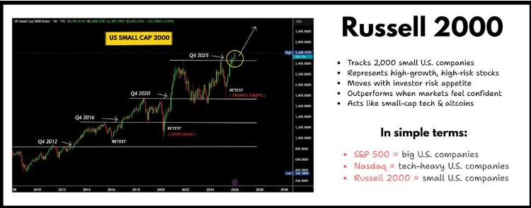 本文要讨论的并非一张加密货币图表,也不是某种Meme币的叙事,甚至暂时与比特币无关。我们要关注的是罗素2000指数(Russell 2000 Index)正悄然完成一项其历史上仅发生过两次的壮举:实现突破,并由此带动风险偏好的回归。 如果你在市场中足够久,那么你已经看过这部“电影”不止一次。 历史总在重复,即使你不相信周期,也应当尊重这种重复性。 2017年,罗素2000指数实现突破,随后,“山寨季”来临。 2021年,罗素2000指数再次突破,随后,“山寨季”再次上演。 尽管每一次的市场叙事不同,热门的代币各异,但其底层的驱动机制是相同的。 如今,在2026年1月,罗素指数历史上首次突破2600点。 这次突破并非假象,也非假日期间因交投清淡引发的虚假波动,而是一次成交量巨大、基础广泛的全面性突破,该指数年初至今的涨幅已达到约15%。 小盘股(Small caps)的交易并非基于市场情绪或感觉,而是一场关于流动性的交易。 罗素指数追踪着大约2000家规模较小的美国公司,包括区域性银行、工业企业、生物科技公司等。这些企业的生存与发展,与借贷环境和增长预期息息相关。 当流动性收紧时,这些公司会遭受重创。 当流动性宽松时,它们则会引领整个市场。 这就是为什么在防御性市场中,罗素指数从不率先启动;而在风险偏好回归时,它却常常成为领头羊。因此,该指数的突破并非一个简单的技术现象,它是一个明确的信号:资本正沿着风险曲线向下移动,寻求更高的回报。 将视野放大,你会发现当前的宏观背景与这一走势形成了令人不安的契合。 美联储正通过购买国库券的方式,悄然为市场储备提供支持。这虽非全面的量化宽松(QE),但足以缓解资金压力,为信贷市场注入润滑剂。 美国财政部正在减少其总账户(TGA)的余额,这意味着将现金推回市场流通,而非抽离。 财政政策在边缘地带逐渐宽松,例如更大规模的退税、潜在的消费补贴,以及通过购买抵押贷款债券来压低利率,从而释放家庭和企业的资产负债表。 单独来看,这些举措中的任何一项都算不上是强烈的“刺激”信号。但当它们汇集在一起时,就形成了一股强大的流动性瀑布。而流动性,从不静止。 这是人们经常误解的部分。流动性并不会凭空从现金“传送”到山寨币,而是遵循一定的顺序和层级流动: 首先,它会稳定债券和融资市场。 然后,它会推高股票市场。 接着,它会在股票市场内部寻找更高贝塔(高风险高回报)的资产。 只有在此之后,它才会溢出到另类资产领域。 小盘股正处于这一链条的中间环节。它们比超级大盘股风险更高,但对于机构投资者而言,其逻辑清晰、易于理解。当小盘股开始跑赢大盘时,通常意味着资本的目光已经越过“安全”,开始追逐“增长”。 这就是为什么罗素指数的突破在历史上总能预示着更广泛的风险资产扩张。这不是巧合,而是一种机械的、必然的传导过程。 加密货币市场并非流动性周期的引领者,而是放大器。 当罗素指数进入持续的上升趋势时,更高贝塔的资产往往会滞后跟随。历史数据多次表明,ETH和山寨币通常会在一到三个月后做出反应。 这并非因为交易员们在交易软件(如TradingView)上紧盯着罗素指数,而是因为推动资本进入小盘股的同一股流动性,最终会去寻找具有更高“凸性”(Convexity,即以较小风险博取巨大潜在回报)的资产。 而加密货币,尤其是经历了投降式抛售、订单簿深度薄、卖方力量枯竭的加密市场,正是这种寻找的终点。这恰恰是2026年初加密市场所面临的格局。 每一个周期,都会有“这次不一样”的理由。 2017年,是ICO的过度泡沫。 2021年,是过高的杠杆和市场泡沫。 2026年,则是监管的不确定性、宏观经济的疑虑以及市场的疲劳感。 这些表面的解释在变,但资金的流动规律不变。 与以往不同的是,如今的市场“管道系统”(即基础设施)已经大为改善:更清晰的监管框架、机构级别的托管标准、现货ETF正在持续吸收市场供应、市场边缘的过度投机性杠杆有所减少。 甚至连行业内部人士也开始公开谈论那些曾经秘而不宣的观点。当CZ谈论潜在的“超级周期”时,他指向的并非炒作,而是多重因素的协同:流动性、监管和市场结构终于开始朝同一个方向发展。这种协同是极其罕见的。 大多数加密货币交易者仍在紧盯加密图表,等待市场自身的确认信号。但这通常为时已晚。 当山寨币开始价格飙升时,资本的轮动早已在其他市场完成。风险偏好回归的信号, 首先出现在那些不需要依靠炒作就能上涨的市场中。小盘股就是这样的市场之一。它们不是靠Meme来拉盘,而是因为借贷变得更容易、资本重拾信心而上涨。 因此,如果因为“这与加密无关”而忽视罗素指数的突破,那就完全错失了要点。 “超级周期”并不意味着所有资产都会永远上涨。它意味着: 结构性支撑:上涨的持续时间比人们预期的要长,因为它是由市场结构而非短暂的狂热情绪所驱动。 回调被吸收:市场的回调会被买盘吸收,而不会演变成连锁式暴跌。 资本轮动而非离场:资本会在不同板块之间轮动,而不是完全撤出市场。 高贝塔资产获得生机:在经历了多年的压制后,高风险高回报的资产终于获得了喘息和上涨的空间。 这正是历史上山寨币停止“流血”、开始价值重估的环境。并非所有山寨币都会上涨,上涨幅度也不会均匀,但趋势将是决定性的。 罗素指数突破历史新高绝非偶然。它发生时,